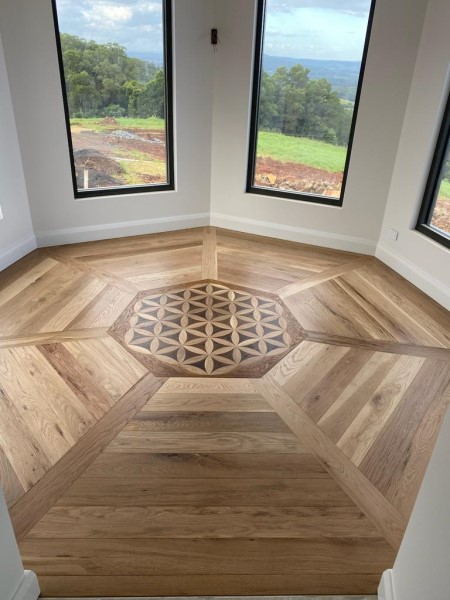 This project represents a very precise, time and labour-intensive example of the intricate parquetry construction Platinum Flooring Solutions is recognised for. Custom European oak solid parquetry was used to create this unique floor and statement piece in the prayer room of a new home. The design includes a seven-sided border made up of 70 pieces of individually cut strip flooring. In the centre, facing true North, is the Flower of Life symbol which represents the cycle of life. The motif is made up of 169 individually cut pieces that were then wire-brushed, micro-bevelled, individually hand stained and assembled.