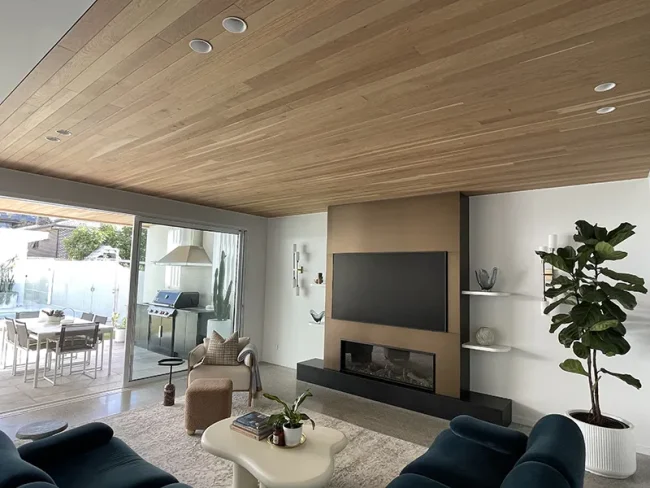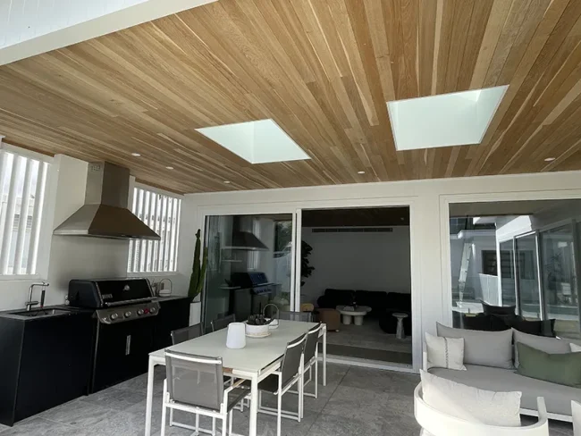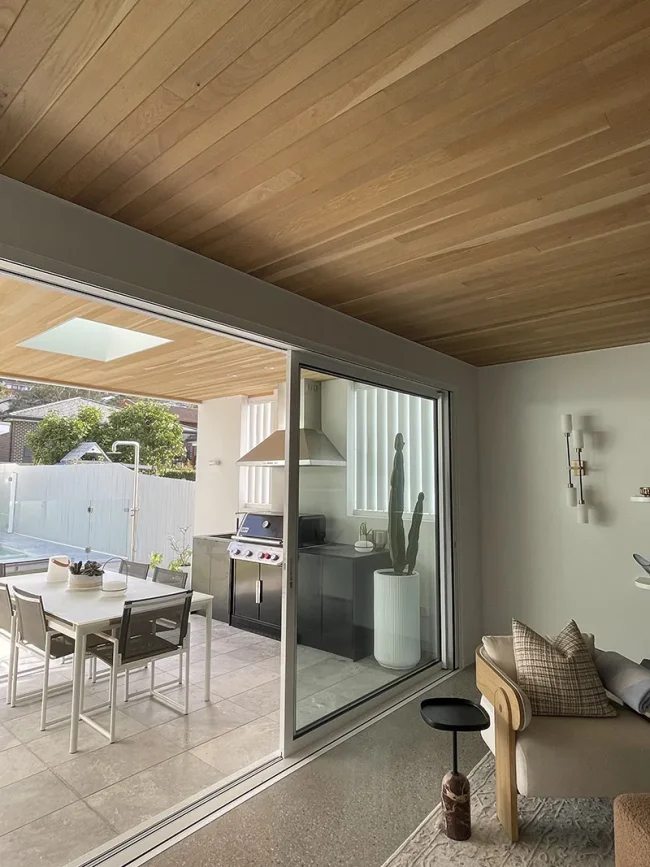 The solid French oak timber ceiling is a key feature of this mid-century modern style home and extends from the living room to the outdoor entertaining area, creating a seamless flow from indoors to out. The timber complements the timber veneer joinery and provides some warmth to contrast with the polished concrete floor and limestone tiles.