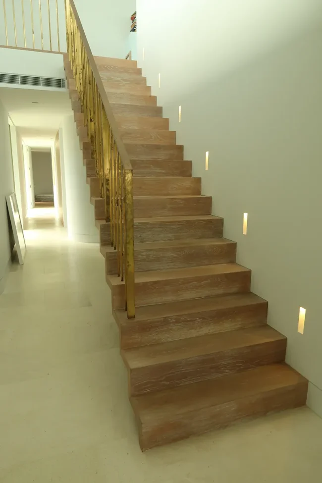 European Oak was wirebrushed and multicoloured onsite to introduce white accents in the grain, creating a more subtle finish than your typical whitewashed look for this new beachside build.