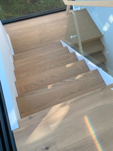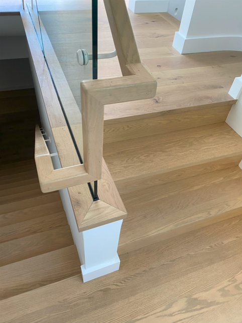 Solid American oak timber was wirebrushed, stained and finished to complement the pre-finished Havwoods Barrington Plank engineered flooring.