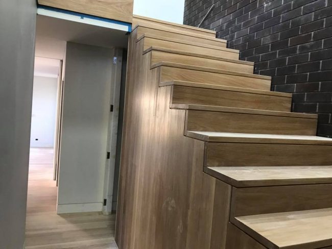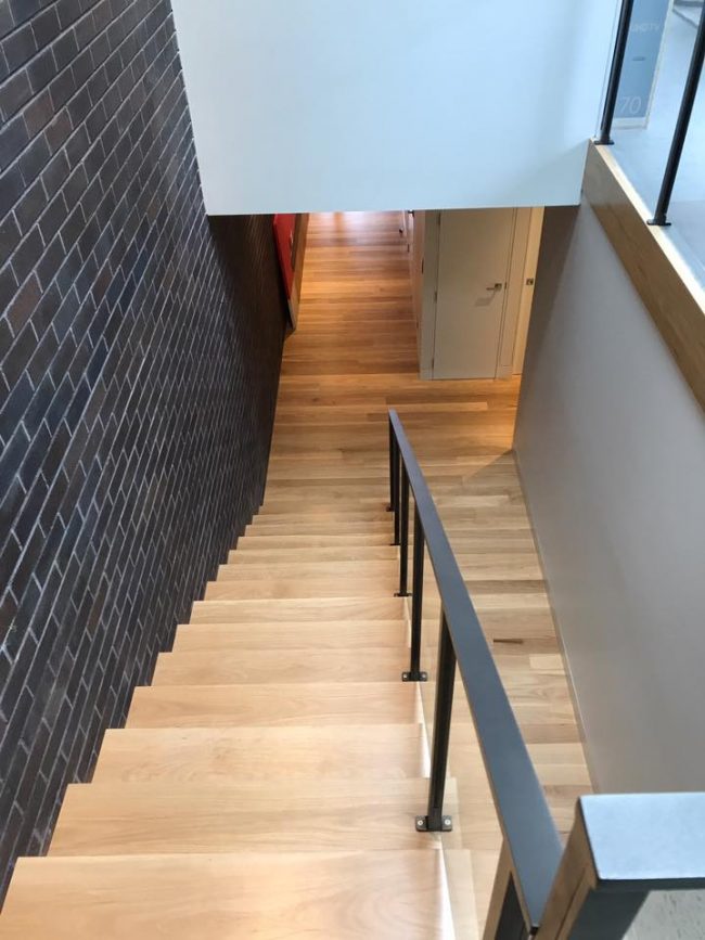 Custom pre-finished Coswick A grade, single section size timber in ginger colour. The staircase is a Hamptons-inspired style with timber treads, white painted risers, brass bar balustrade and a solid oak handrail.