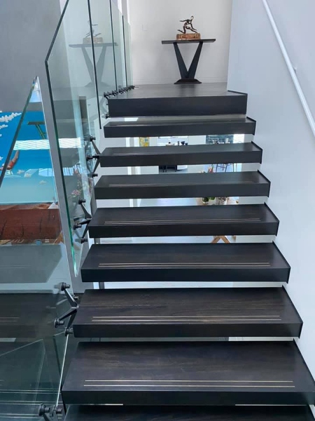 Solid custom stained Blackbutt with aged brass inlay new installation.
